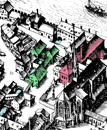(rot) auf die Ecke der Stadtmauer
